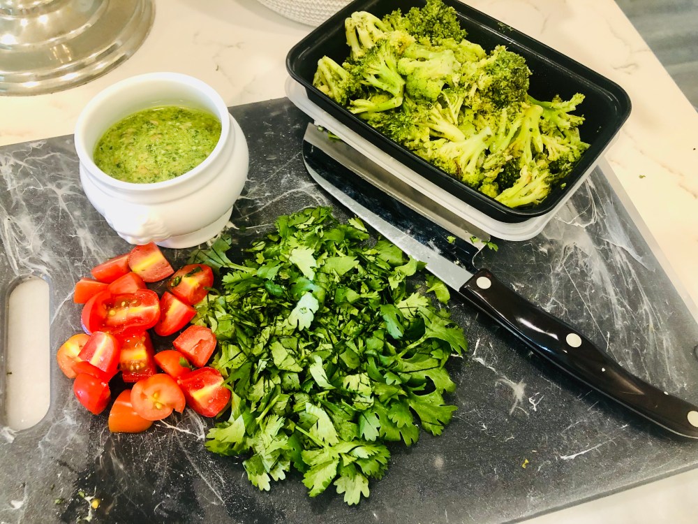 In the meantime, place the remaining pesto in a small vessel so you can offer it as an additional topping. I also added some parsley to the top of the casserole when finished; this is obviously optional but now would be a good time to rinse and chop the parsley.