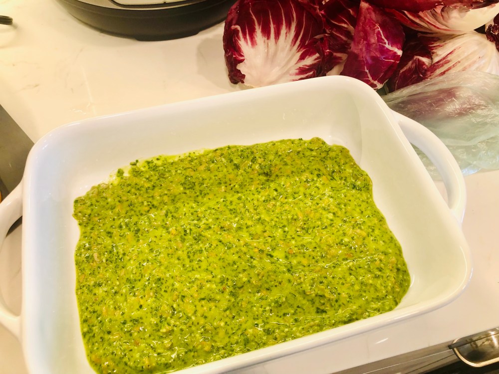 If it’s to your liking, pour out two thirds of the pesto onto the bottom of your casserole dish to make a bed for the radicchio.