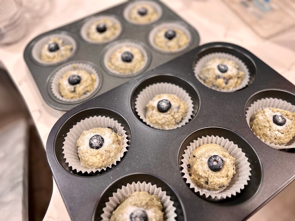 Take one blueberry and place it in the middle of each mixture. Top each with a teaspoon of Monkfruit In The Raw (if you could not locate, Granulated Monkfruit is fine). This will help brown and get a nice crunchy top.